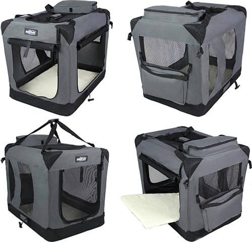 It features two large doors with dual latches, one on the front and one on the side. This crate is lightweight and easily portable, which makes it perfect for travel.